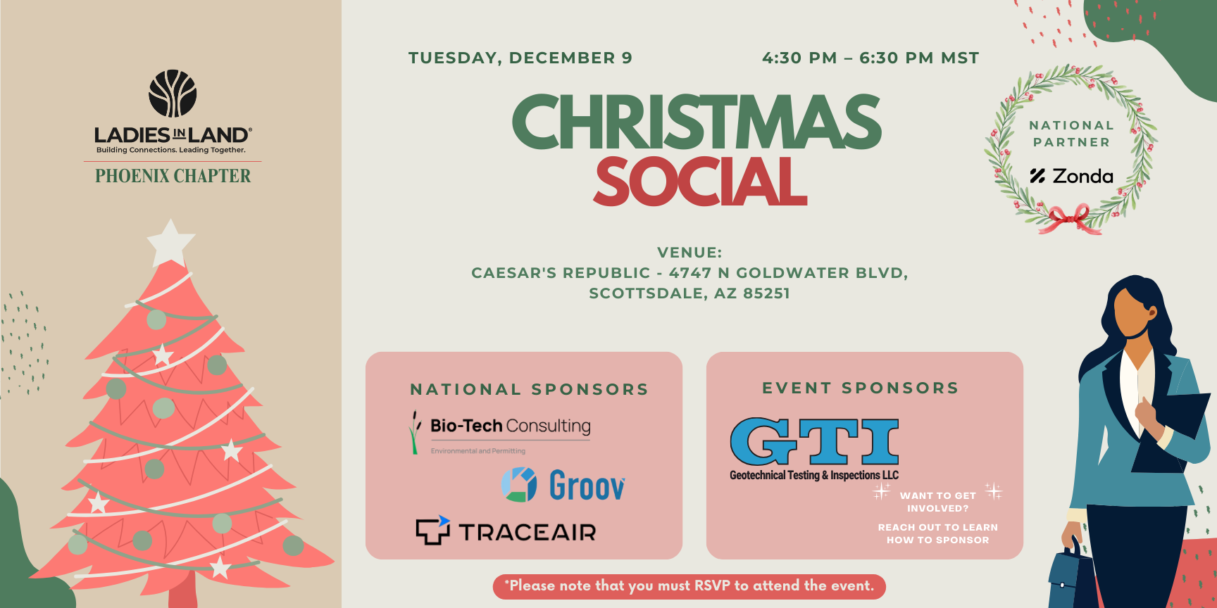 Join the Ladies in Land Phoenix Chapter on December 9th from 4:30 PM – 6:30 PM MST for a festive evening of connection, celebration, and holiday cheer at Caesar's Republic.