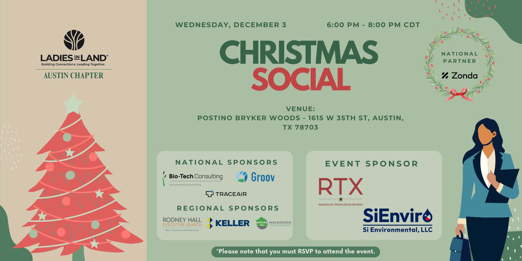 Join the Ladies in Land Austin Chapter on December 3rd from 6:00 PM – 8:00 PM CST for a festive evening of connection, celebration, and holiday cheer at Postino Bryker Woods.