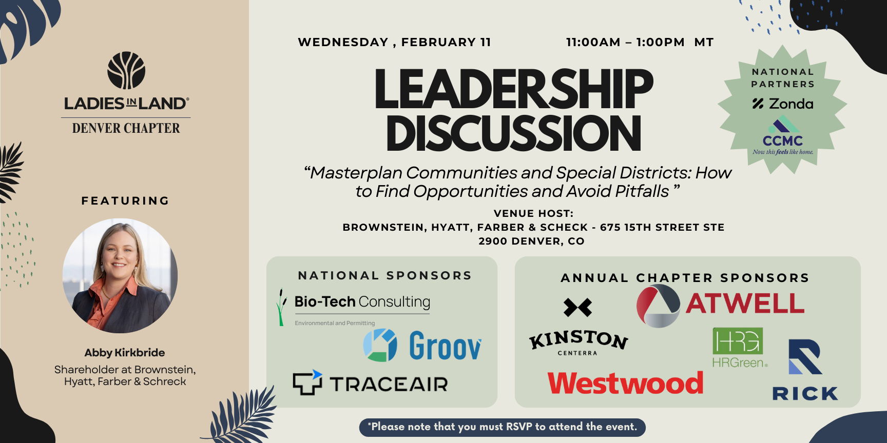 Featuring Abby Kirkbride of Brownstein, Hyatt, Farber & Schreck, this session will focus on “Masterplan Communities and Special Districts: How to Find Opportunities and Avoid Pitfalls.”